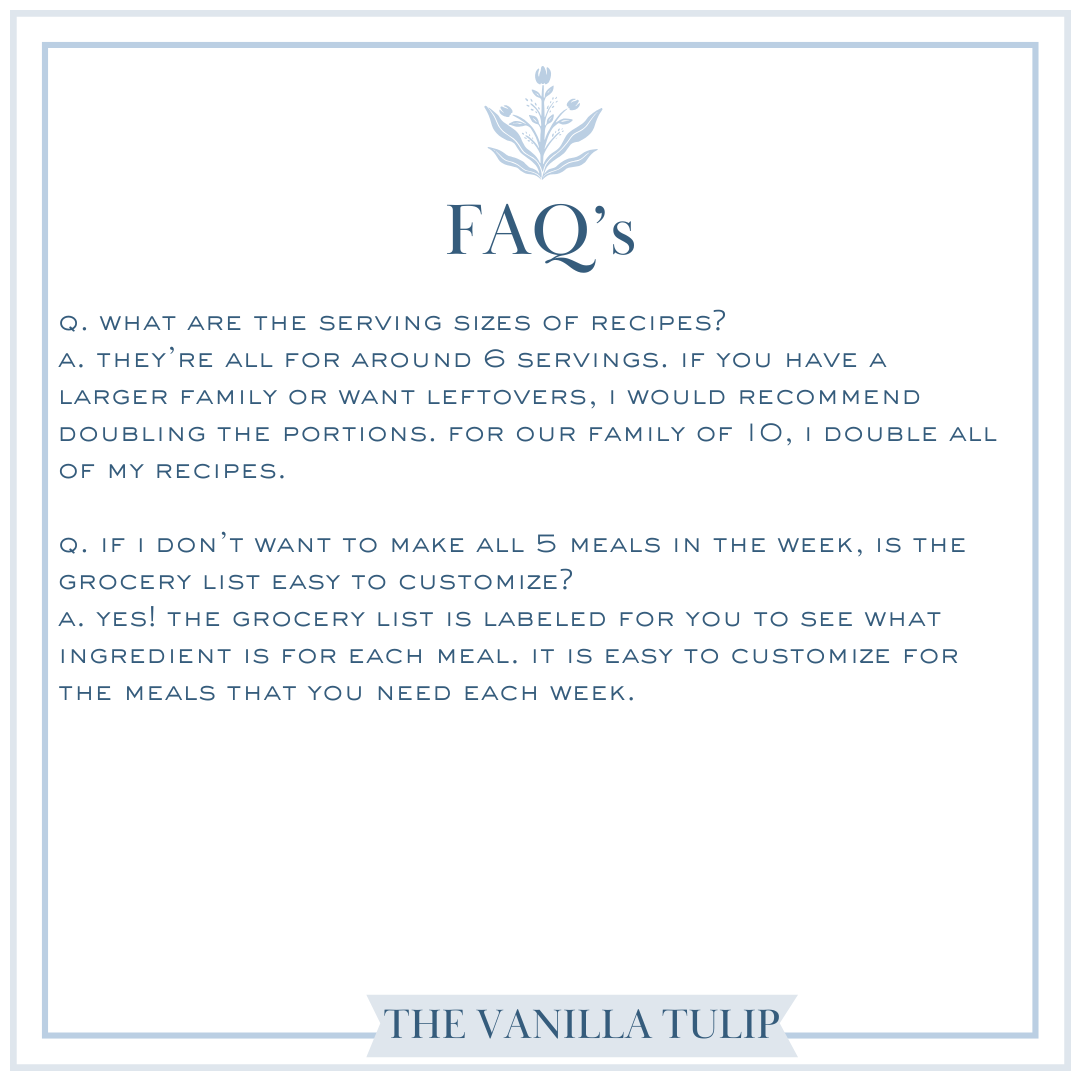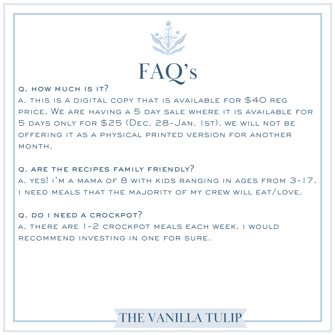 In the Winter 3 Month Menu Plan: Volume 2, I walk you through 3 months of meal plans for your family. You'll be provided with 5 days of family-friendly meals a week, coordinating grocery lists, coordinating prints, weekly tips on how to save more time and much more!